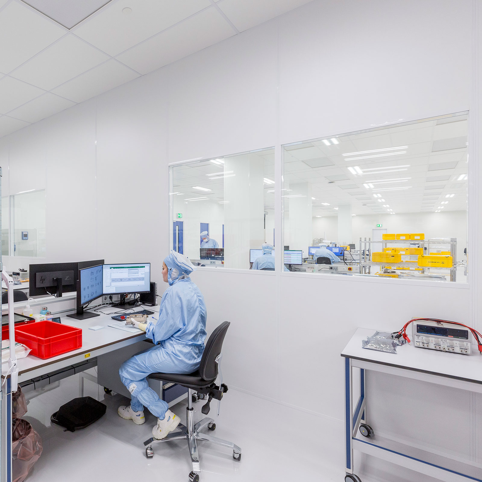 Cleanroom windows flush installed 1200 x 1200 mm (wxh) in size, consisting of aluminium profiles and 2 layers of safety glass 6 mm thick. The window is fully correctly sealed using prefabricated sealant joints.